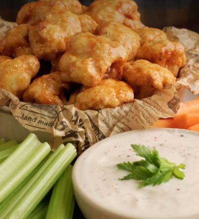 Die Blumenkohl Wings könnt ihr nach Wahl mit Karotten und Selleriestangen servieren.