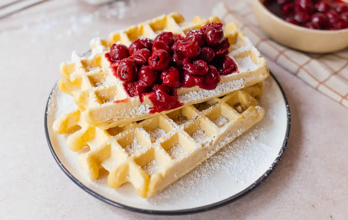 Den Teig nach und nach zu goldbraunen Waffeln verarbeiten und mit Toppings eurer Wahl servieren.